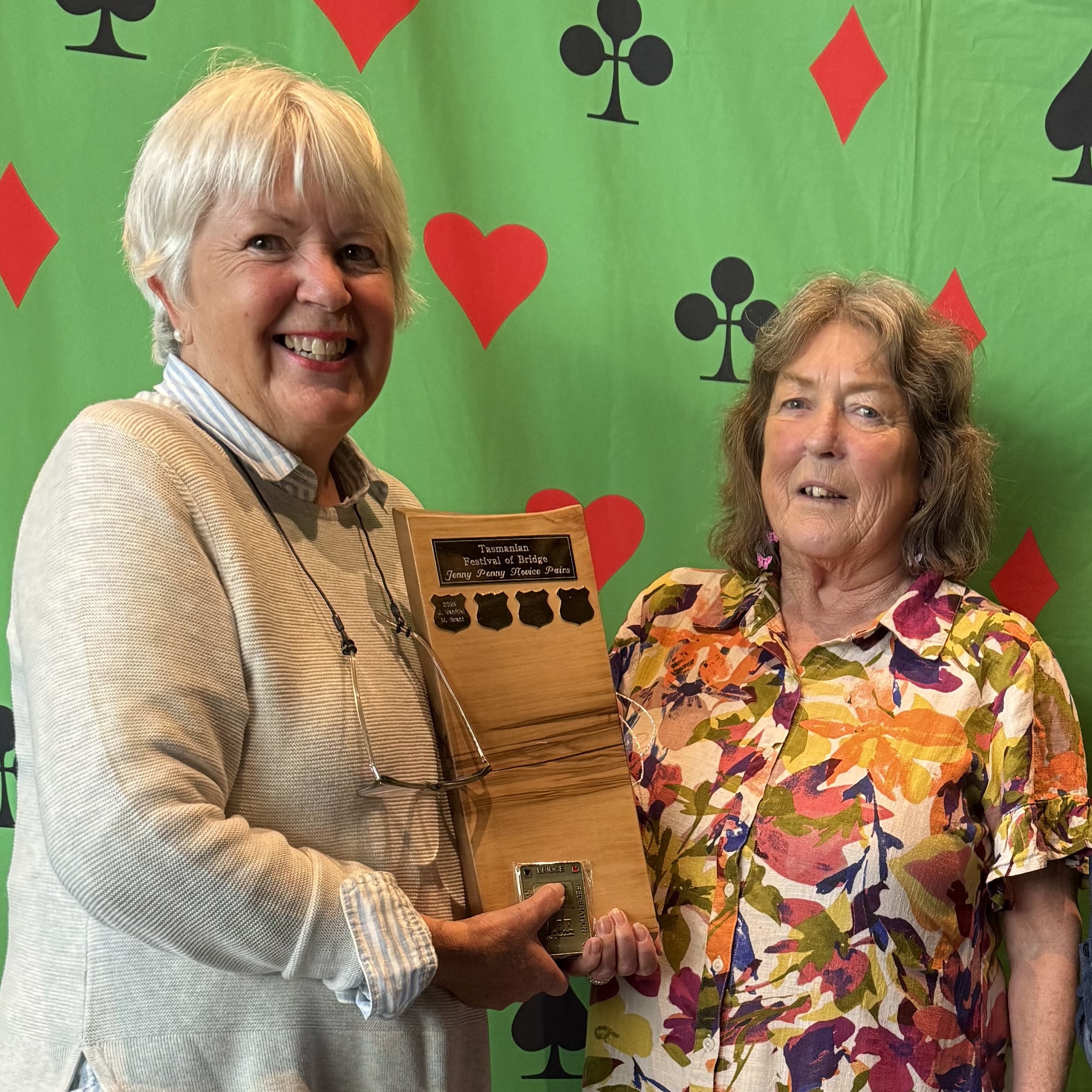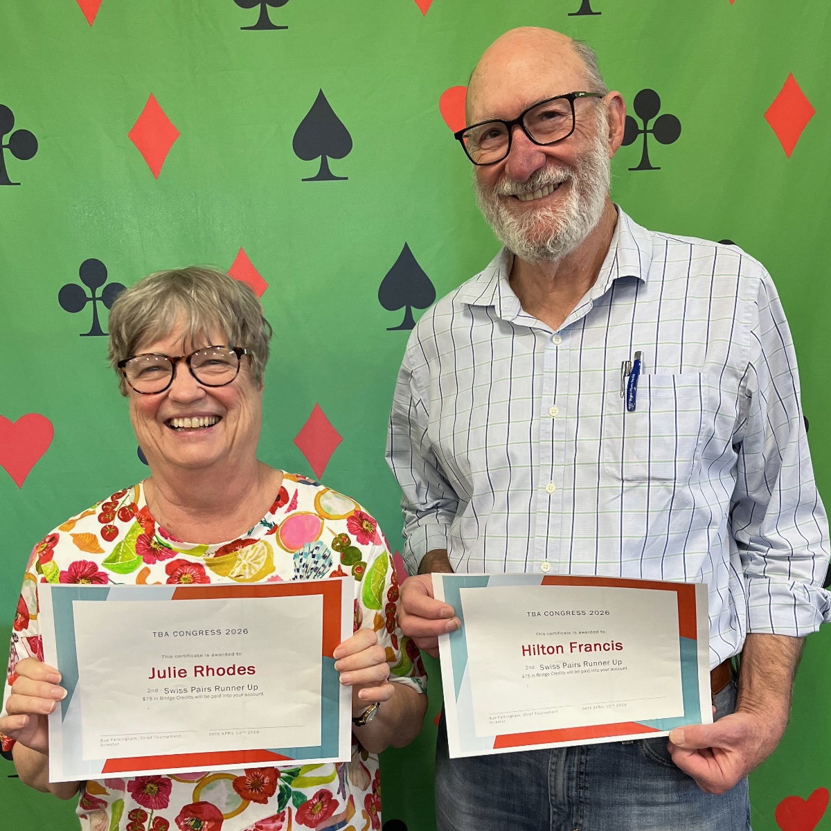 The 2026 TBA Congress was held on 11th and 12th April 2026. Saturday was Matchpoint Pairs with Open and Novice sections (20 and 8 pairs respectively). Sunday had 38 pairs playing IMP scored Swiss Pairs. The TBA provided a light lunch each day, which was partially catered by students at Rosny College.