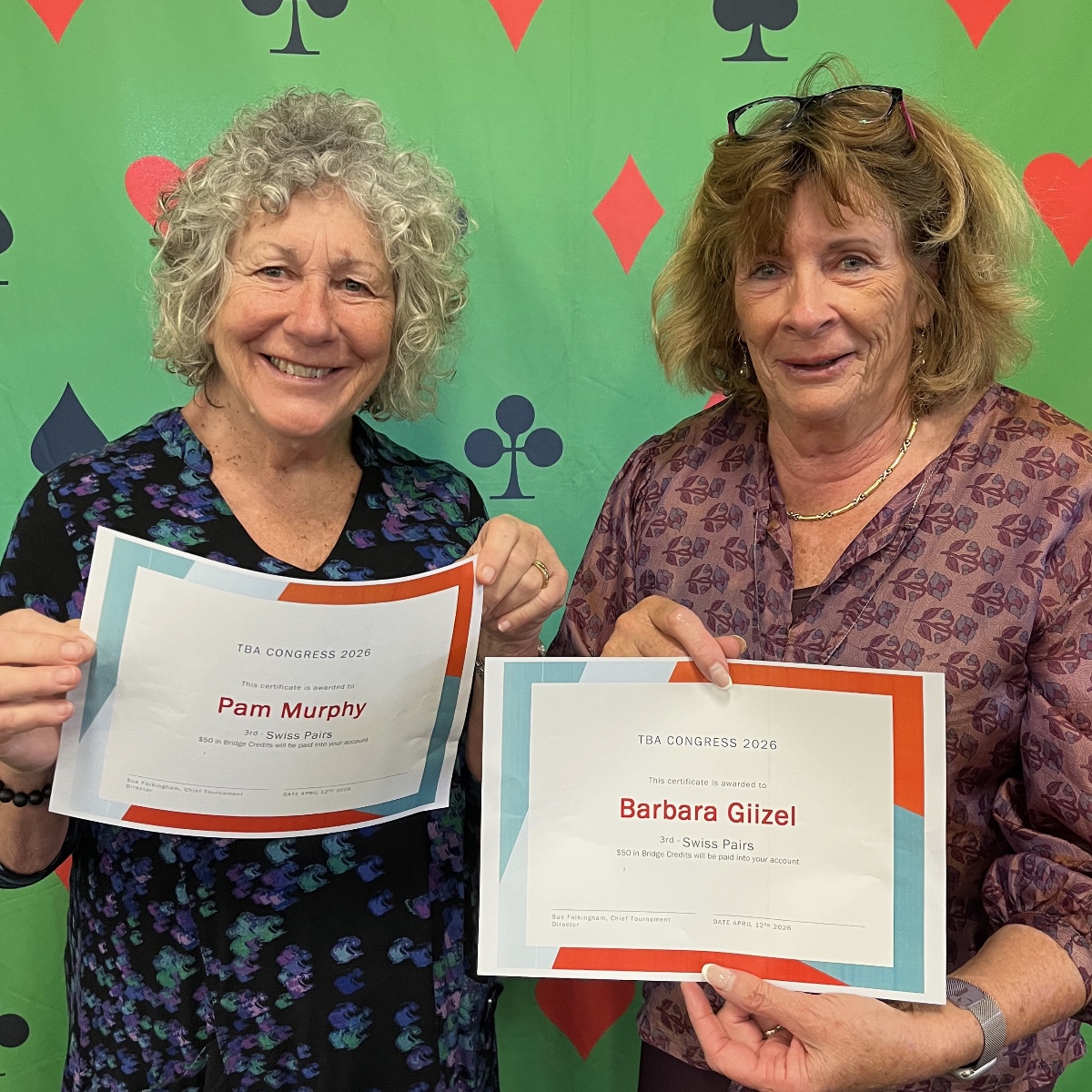 The 2026 TBA Congress was held on 11th and 12th April 2026. Saturday was Matchpoint Pairs with Open and Novice sections (20 and 8 pairs respectively). Sunday had 38 pairs playing IMP scored Swiss Pairs. The TBA provided a light lunch each day, which was partially catered by students at Rosny College.